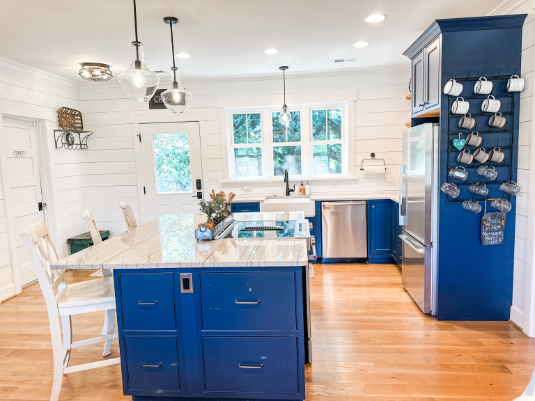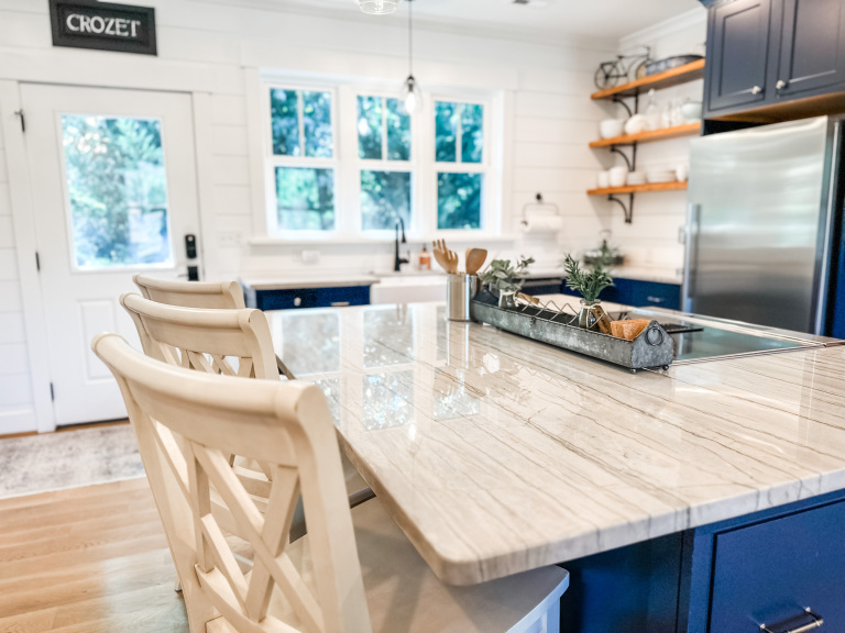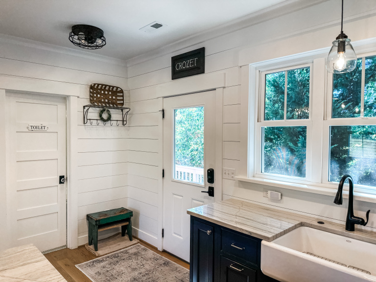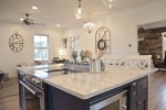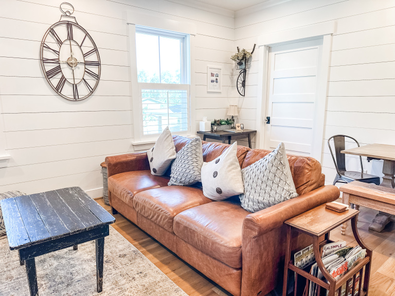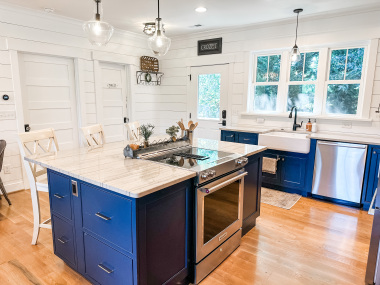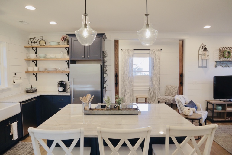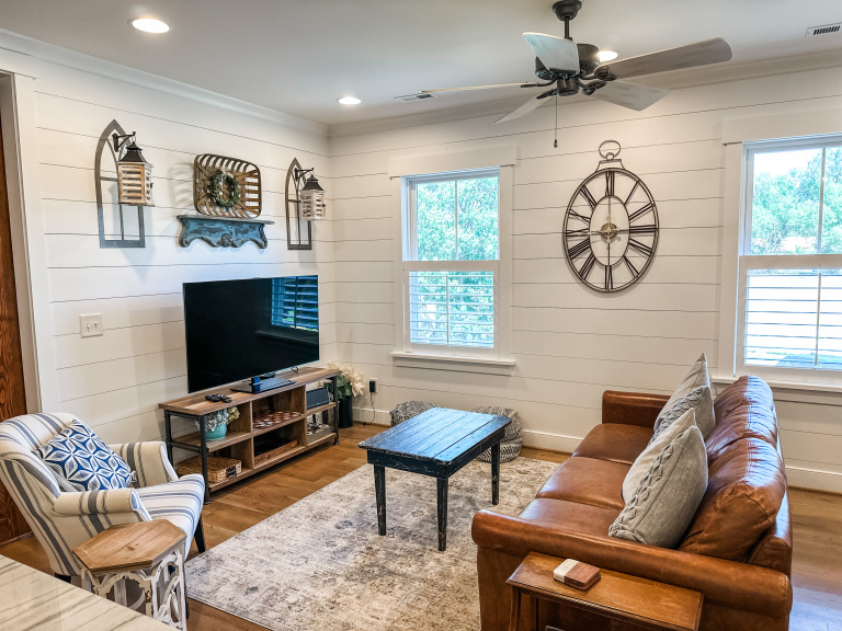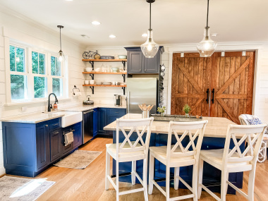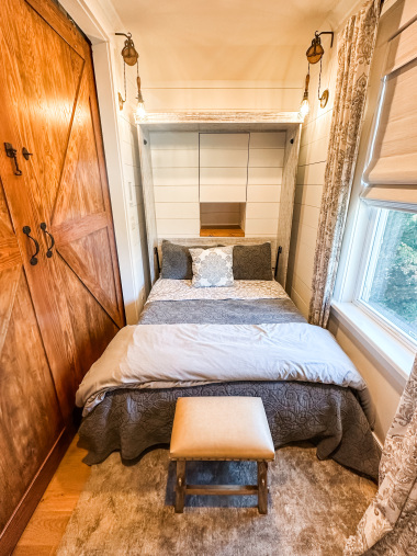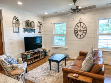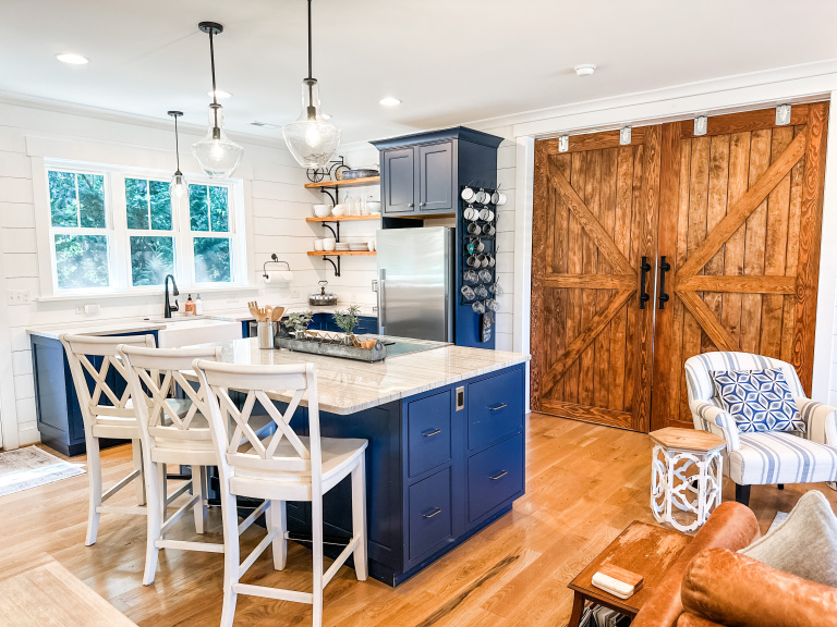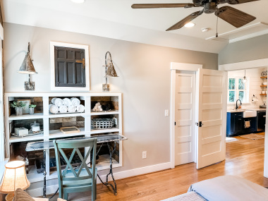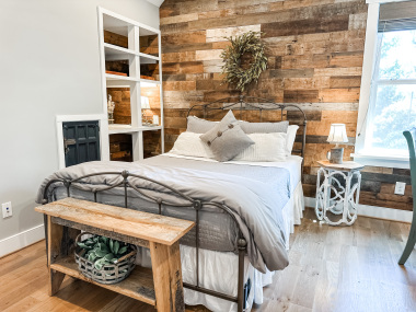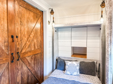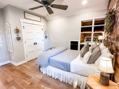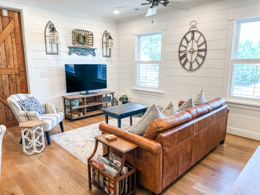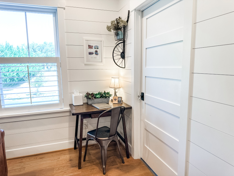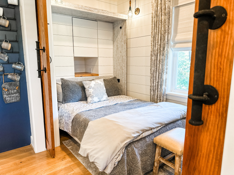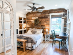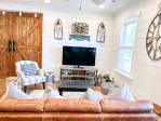 Whether visiting family or friends in the area, attending a wedding or event or just getting away for a great experience you'll find your happy place at The Barn at Haden. If you enjoy staying in a place that has all the conveniences of your own home, that's how we designed the space. It features, a fully equipped kitchen with dishwasher, microwave, stove/oven, farmhouse sink, full size refrigerator and quartzite countertops. The oversized island will surely be the hangout spot in the space. A full size dining table is offered for meals. The family room offers a large HDTV. There's a laundry room with washer and dryer and both bedrooms have their own closets with hangers. The 2nd bedroom can be created by closing the two 4' barn doors and pulling down the double size murphy bed. If you are a guest that only needs one bed, then the barn doors remain open for an additional sitting room to retreat to. There's an abundance of natural light thru every window but the lights you do need to turn on are powered by solar energy in the home. There is a separate exterior staircase that leads to an oversized elevated deck for enjoying mountain views.